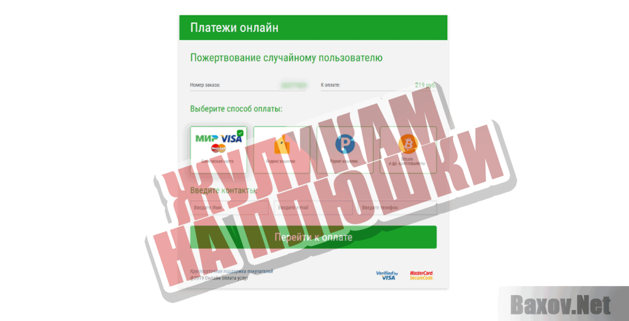 И мы автоматически переходим на сервис приема платежей infokassa.org. Подобные сервисы выступают в роли гаранта между покупателем и продавцом цифровых товаров (документы, аккаунты или другая информация). Суть заключается в том, что вы покупаете товар «Пожертвование случайному пользователю» и в замен получите какой-то текстовый файл. По итогу деньги переходят к мошенникам и продолжают поступать дальнейшее требования по оплате.