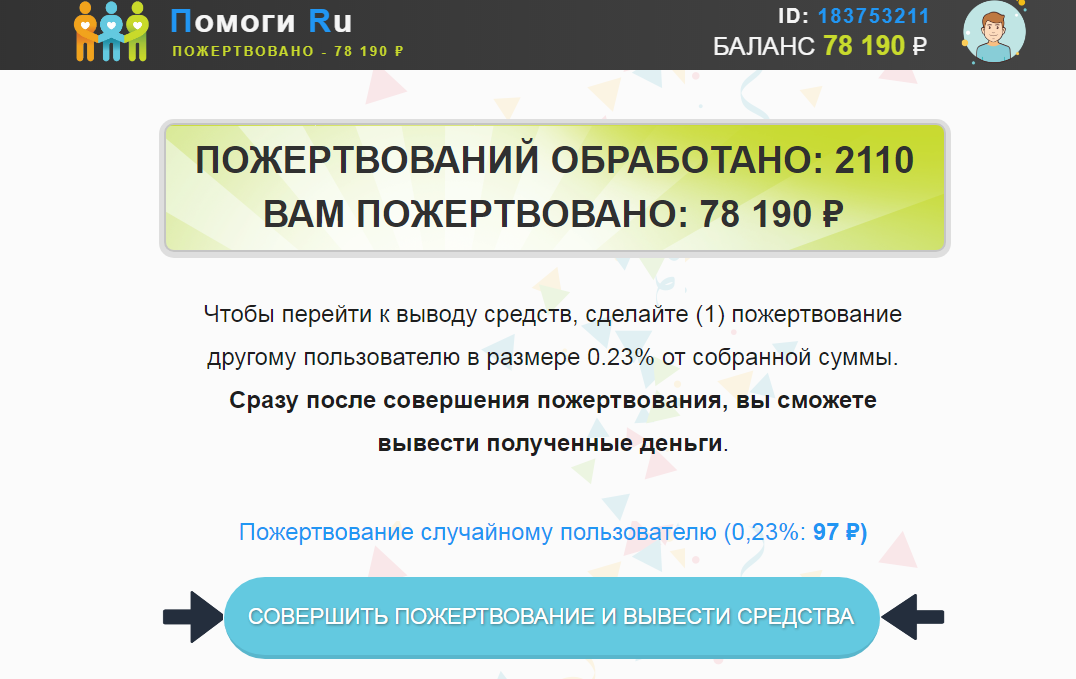 Организаторы Помоги RU придумали неплохую схему развода для отчаявшихся людей. Если бы все их обещания были правдивыми, то этот проект бы очень выручил многих людей. Но, к сожалению, в современном мире очень тяжело найти организацию, которая станет тебе просто так помогать. Главная суть Помоги RU в том, что люди со всего мира могут рассчитывать на поддержку от посторонних людей, тем самым будут решать финансовые трудности. Каждый день можно получать не более 100 000 рублей просто так. Ну не сказка ли? Нужны деньги – зашел на Помоги RU и получил их, ничего не сделав.