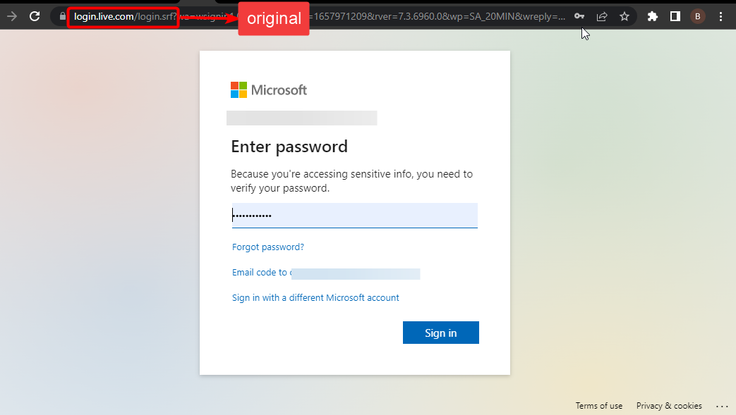 Первое, на что следует обратить внимание, это адрес. Исходный адрес входа в Microsoft обозначается как login.live.com/