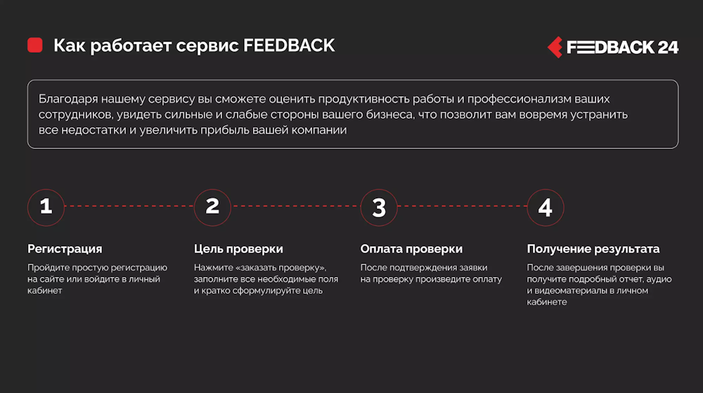 Сервис тайных покупателей Feedback 24 предоставляет инструменты для выявления разрыва между предполагаемым и фактическим качеством обслуживания в вашем бизнесе. Опытные тайные покупатели, действуя как реальные клиенты, собирают информацию о продуктах, качестве обслуживания и фиксируют замечания. Они предоставляют структурированные отчеты с фотографиями или видеозаписями. Это позволяет выявить ожидания клиентов, проверить соблюдение стандартов, оценить качество обслуживания, провести мерчендайзинг, оценить действия ваших конкурентов и даже мониторить цены.