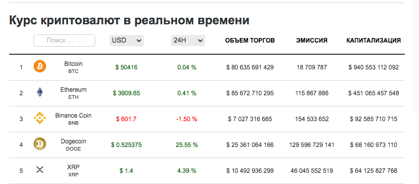 Этот список сегодня можно уверенно дополнять криптовалютами. Самый простой способ заработка на ценообразовании альткойнов — покупка и удержание. На момент написания статьи в ТОП-5 цифровых финансовых инструментов по уровню капитализации входят следующие: