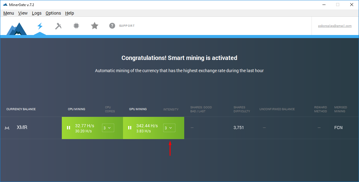 После бенчмарка жмем «Start smart mining» и попадаем в интерфейс майнера. Здесь можно увидеть главную и «добавочную» криптовалюту (главная — в строке слева, добавочная — в столбце Merged), их хешрейты и интенсивность майнинга. Интенсивность можно изменять, кликая на соответствующую кнопку и выбрав новое значение из списка.