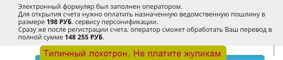 Далее перед пользователем появляется окно для внесения оплаты. Пользователь ее вносит и ожидает открытия счета, поступления средств. Конечно же, никто счет не открывает и деньги не отправляет. На следующем этапе опять потребуется оплата, и с каждым разом ее сумма будет все больше и больше.
