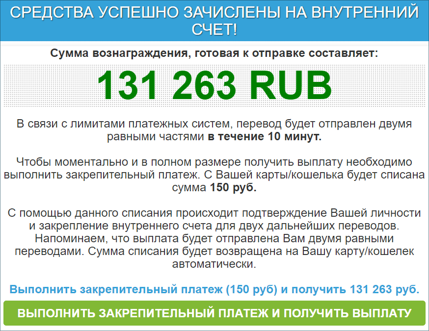 Обман происходит по уже знакомому сюжету. Сначала предлагают ввести контактные данные (на этот раз достаточно всего лишь имени и фамилии), а затем ответить на вопросы о брендах, которые больше нравятся. По окончанию опроса сайт мошенников выведет сообщение о сумме вознаграждения (снова трехзначная сумма), для получения которой нужно выполнить закрепительный платеж — 150 рублей.