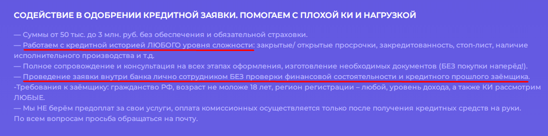 Если более конкретно, то нам обещают много денег, на долгий срок, при этом не важно сколько нам лет и какая у нас кредитная история. И главная вишенка на торте — 100% гарантия
