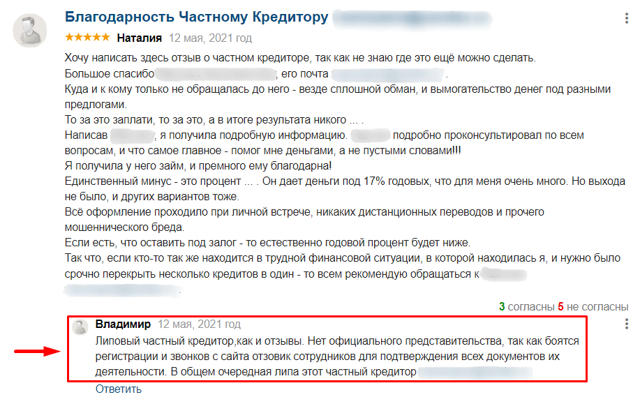 Кроме того, подобные объявления о частных займах не редко сопровождаются проплаченными отзывами. Но за подобными комментариями могут скрываться как сами кредиторы, так и частные брокеры.