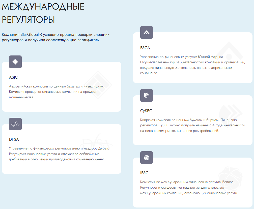 Большинство сайтов, созданных в оффшорной зоне, функционируют незаконно, и сайт StarGlobal-R не является исключением. По отзывам пользователей, информация о юридических реквизитах, лицензиях и документах на сайте является вымыслом.