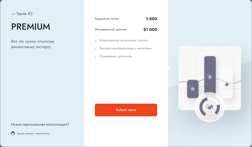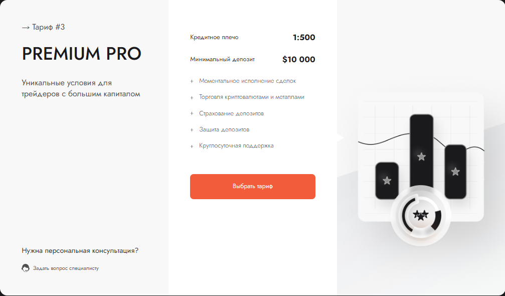 - Premium Pro. Надо заплатить десять тысяч долларов, чтобы открыть леверидж 1:500. Депозиты всегда страхуются, задержки при исполнении ордеров отсутствуют. Техподдержка готова в любое время дня отвечать на вопросы.
