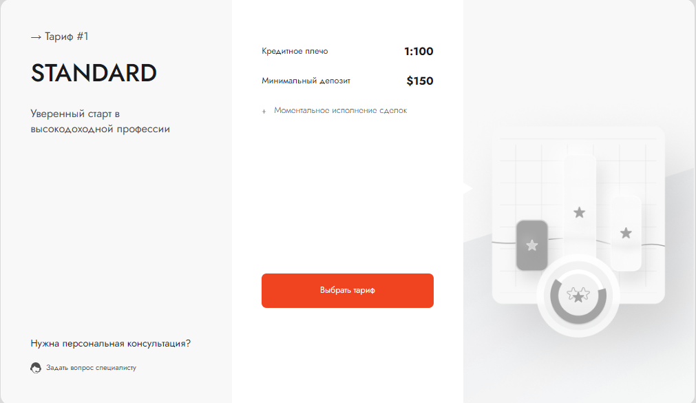 - Standard. 150 долларов. Кредитное плечо в размере 1:100. Ордера исполняют так же быстро, как и для владельцев других счетов.
